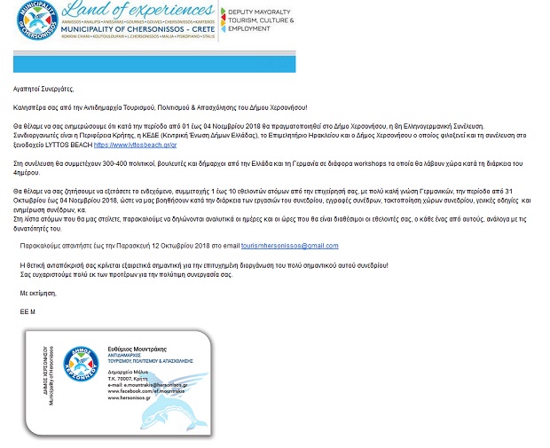Διαβάστε το ηλεκτρονικό μήνυμα που έστειλε η αντιδημαρχία Τουρισμού σε ξενοδόχους της περιοχής: