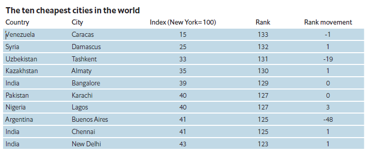 Στον αντίποδα, οι τρεις φθηνότερες πόλεις για να ζει κανείς είναι το Καράκας της Βενεζουέλας, η Δαμασκός στη Συρία και η Τασκένδη στο Ουζμπεκιστάν.