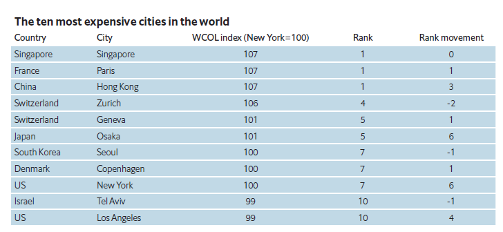 Σε διεθνές επίπεδο, τα σκήπτρα της πιο ακριβής πόλης για να ζει κανείς, κατέχει για έκτη διαδοχική χρονιά η Σιγκαπούρη, η οποία όμως φέτος μοιράζεται την 1η θέση με το Χονγκ Κονγκ και το Παρίσι. Πρόκειται για την πρώτη φορά στην ιστορία της έρευνας της EIU, που τρεις πόλεις αναδεικνύονται ως οι ακριβότερες του πλανήτη.