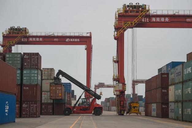 Ένας εργαζόμενος φορτώνει εμπορευματοκιβώτια στο λιμάνι Yangpu στην επαρχία Hainan της Κίνας, τον Απρίλιο του 2020. Xinhua News Agency / eyevine / Redux