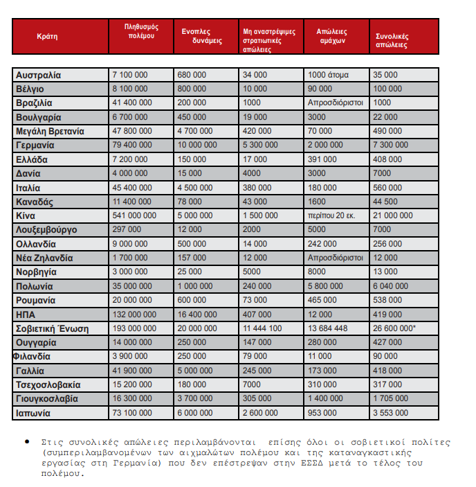 Μόνο τα πιο πρόσφατα επίσημα στοιχεία για τη Σοβιετική Ένωση και την Γερμανία έχουν διορθωθεί στον παρακάτω πίνακα, όπου στα στοιχεία για τη Γερμανία έχουν συμπεριληφθεί και αυτά για την ενταγμένη στο Τρίτο Ράιχ Αυστρία, και στις πληροφορίες για μη αντιστρέψιμες απώλειες των Σοβιετικών ενόπλων δυνάμεων περιλαμβάνονται επίσης και οι αιχμάλωτοι που δεν επέστρεψαν στην ΕΣΣΔ μετά το τέλος του πολέμου. Πρέπει να υπενθυμίσουμε ότι ο μεγάλος αριθμός θυμάτων πολιτών στην Ανατολική Ευρώπη οφείλεται σε μεγάλο βαθμό στη συνειδητή ρατσιστική πολιτική της ναζιστικής Γερμανίας για την εθνοκάθαρση των Σλάβων, Εβραίων και Ρομά. Για παράδειγμα, στην Πολωνία, έχουν πεθάνει σχεδόν 3.000.000 Εβραίοι (88% του συνολικού εβραϊκού πληθυσμού),στο έδαφος της Σοβιετικής