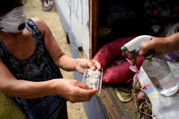 Μια γυναίκα καθαρίζει με αλκοόλ ένα χαρτονόμισμα των 5 δολαρίων στο El Real, στο Εκουαδόρ, τον Μάιο του 2020. Santiago Arcos / Reuters