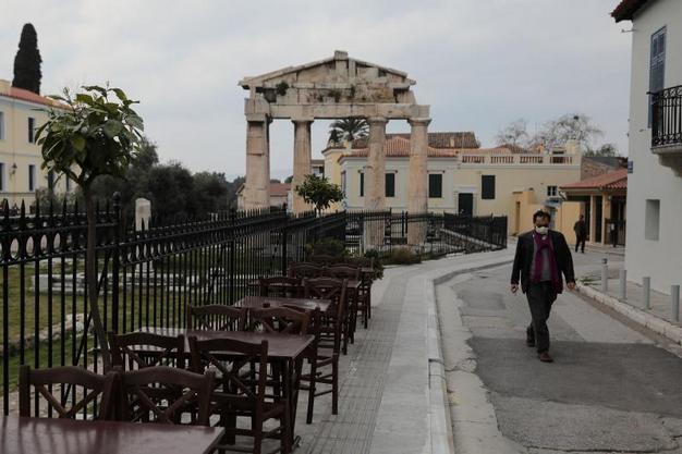 Ένας άντρας στην αρχαία Ρωμαϊκή Αγορά στην Αθήνα, τον Μάρτιο του 2020.