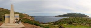 Το μνημείο για τα θύματα του SS ORIA, έργο του γλύπτη Θύμιου Πανουργιά, Στο βάθος δεξιά η νησίδα Πάτροκλος.